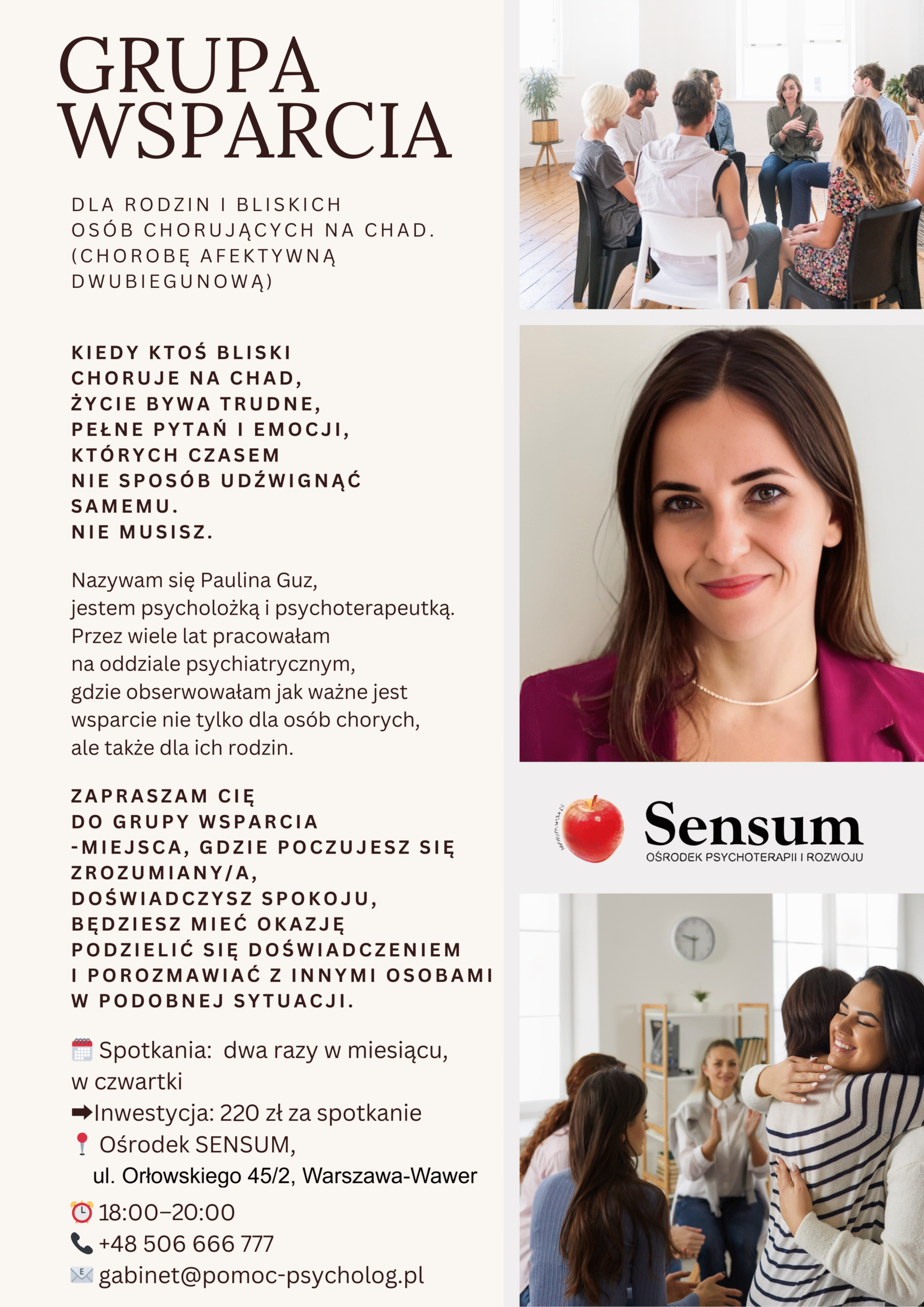 Nazywam się Paulina Guz, jestem psycholożką i psychoterapeutką. Przez wiele lat pracowałam na oddziale psychiatrycznym, gdzie obserwowałam jak ważne jest wsparcie nie tylko dla osób chorych na ChAD, ale także dla ich rodzin. To bardzo ważne, aby nie tylko chory został otoczony opieką, ale również, żeby jego najbliższe otoczenie rozumiało tę chorobę i mogło otrzymać adekwatne wsparcie w towarzyszeniu bliskiej osobie. To właśnie podczas pracy na oddziale narodził się mój pomysł stworzenia tej grupy, na którą serdecznie zapraszam.
